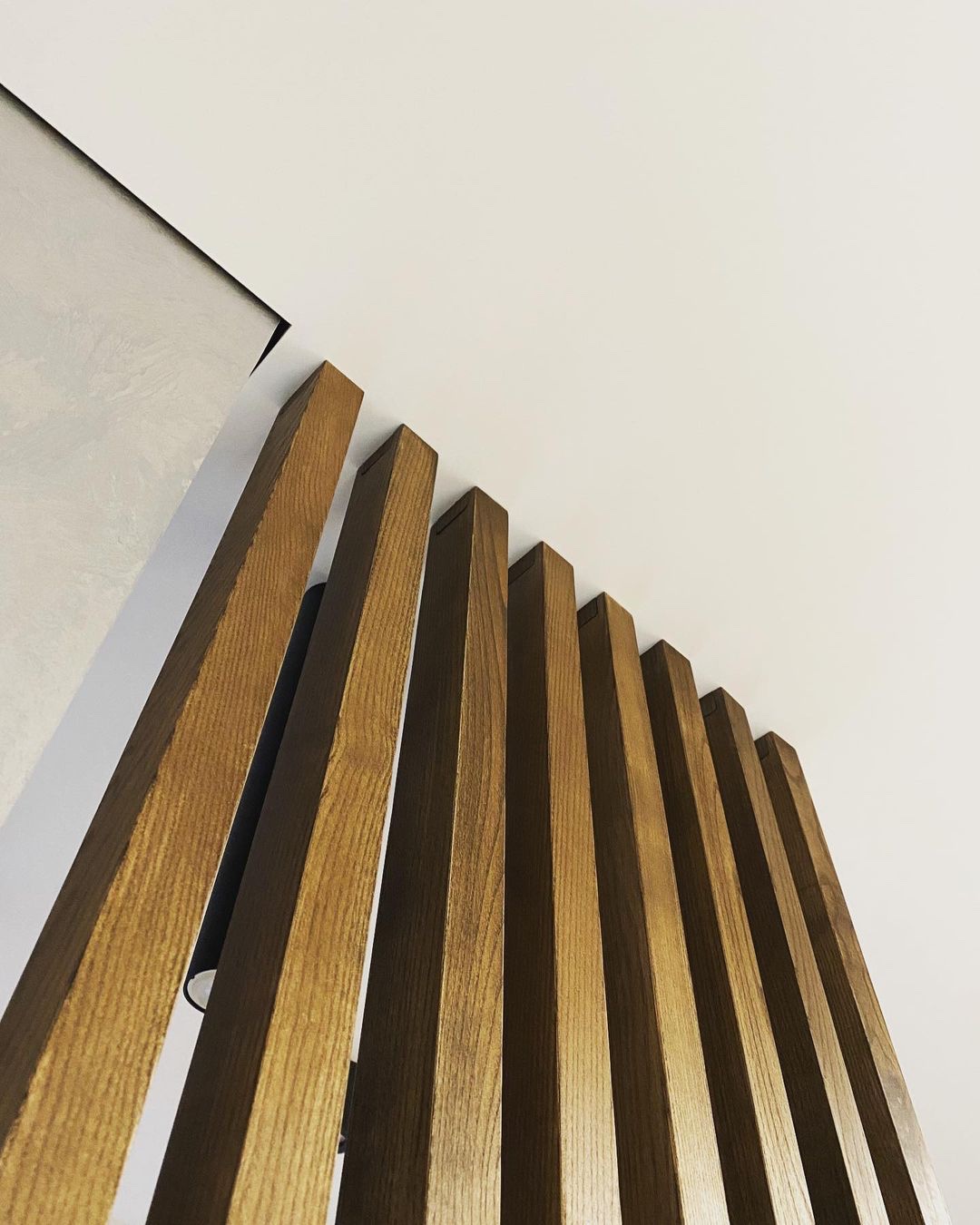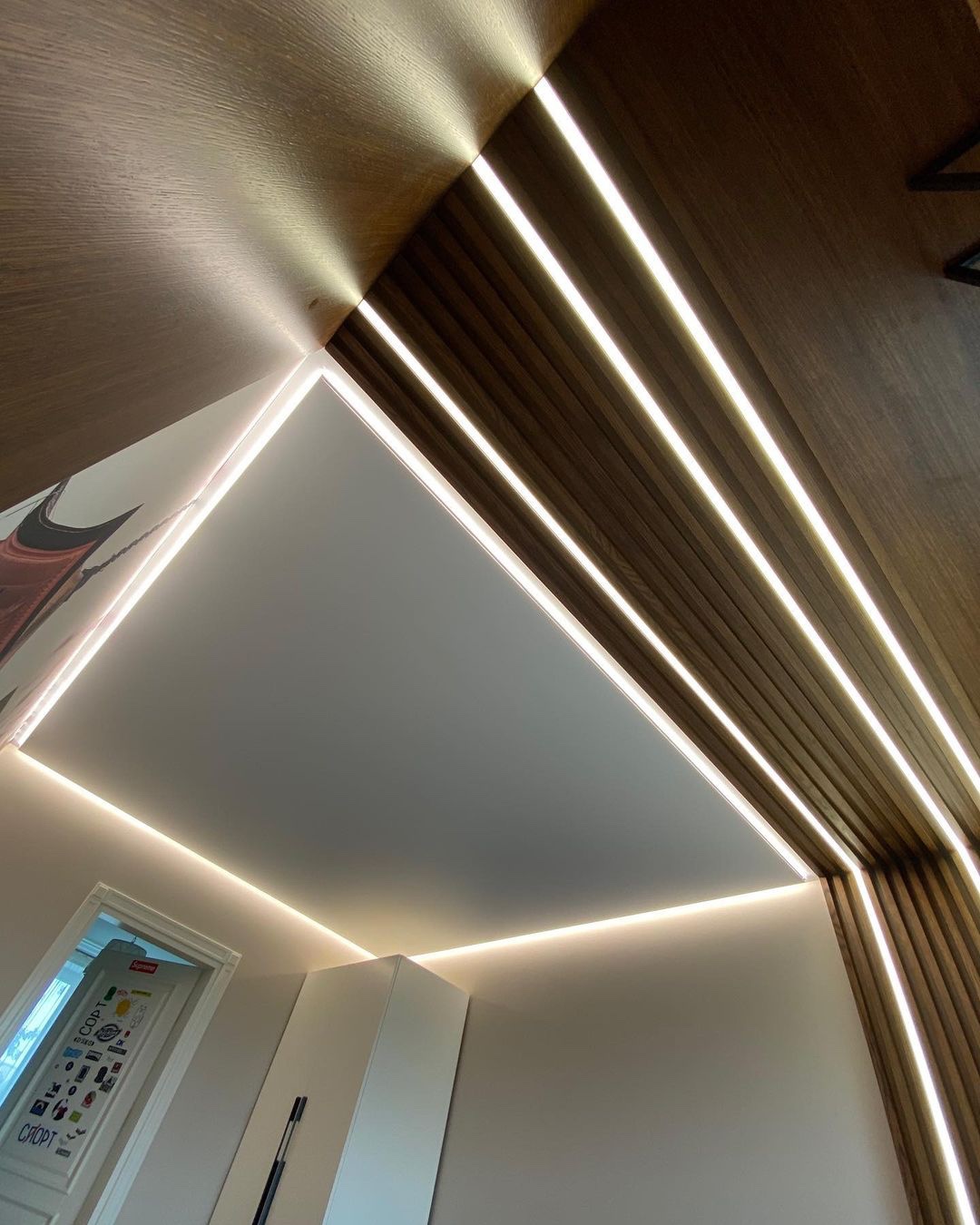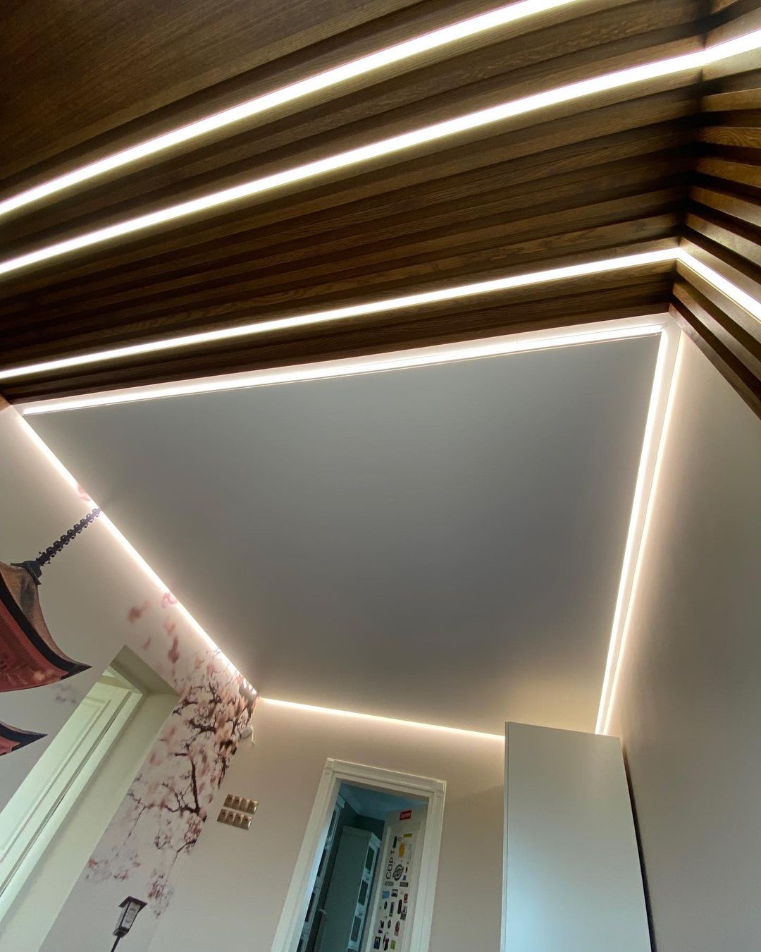 Увеличенное расстояние от стены + более мощная светодиодная лента ,позволяет создать основной источник освещения в помещении без дополнительных источников света! Стильные рейки с встроенной подсветкой очень уместно дополнили интерьер!